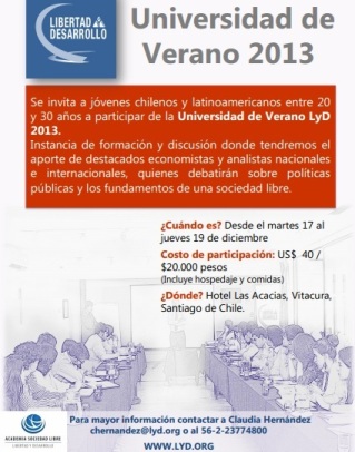 La Universidad de Verano de LyD es un seminario intensivo de 2 días y medio, a realizarse desde el martes 17 al jueves 19 de diciembre, en la ciudad de Santiago. Dirigido a jóvenes de toda Latinoamérica entre 20 y 30 años con capacidades de liderazgo e interés en las políticas públicas, la democracia y la libertad.