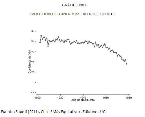 En cuanto a la evolución que han tenido los índices de desigualdad en Chile, se suele ver con preocupación que éstos no muestran mejorías en el tiempo. Sin embargo, el análisis más detallado que hace el economista Claudio Sapelli de los datos, revela que las nuevas generaciones sí tienen niveles cada vez menores de desigualdad, lo que no se percibe al considerar los datos de manera agregada. El Gráfico Nº 1 muestra la evolución del Gini promedio por cohorte en Chile. Observamos que las generaciones más jóvenes tienen niveles de desigualdad mucho menores que antes, y la tendencia es decreciente. Si bien los datos del Gráfico Nº 1 mezclan distintos efectos que inciden en la desigualdad, en su libro, Sapelli muestra que una vez aislado el efecto de la cohorte, se sigue observando un patrón decreciente de la desigualdad durante las últimas décadas.