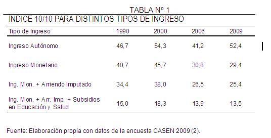 La Tabla Nº 1 muestra el índice de desigualdad 10/10 (1) en Chile para distintos tipos de ingresos familiares, para poder apreciar el efecto que tiene la política social sobre la distribución de ingresos. El índice 10/10 muestra cuántas veces más, en promedio, gana una persona que pertenece al 10% más rico de la población, en comparación con una persona del 10% más pobre.