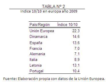 La Tabla Nº 2 muestra el índice 10/10 para algunos países europeos y para la Unión Europea como región. Vemos que el índice de desigualdad que incorpora las políticas sociales en Chile, alcanza niveles comparables con los de países como Dinamarca o España. Si bien la comparación entre los valores de las Tablas Nº 1 y Nº 2 no es tan directa, porque los valores de la Tabla Nº 2 no consideran el efecto de las políticas sociales de sus respectivos países, la comparación sí es razonable, debido a que en estos países europeos, los subsidios en educación y salud llegan a toda la población, mientras que en Chile juegan un rol importante como mecanismos de redistribución de ingresos. La Unión Europea tiene un índice 10/10 bastante mayor al de cada uno de sus miembros. Esto se debe a que los países que componen la Unión Europea son bastante heterogéneos entre sí. El valor del índice 10/10 de la Unión Europea es comparable con el nivel que tiene en Chile este índice considerando sólo los subsidios monetarios y el arriendo imputado.