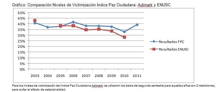 - A pesar de que el índice Paz Ciudadana mide un delito específico (robo), y por ende no podemos hablar de victimización en general, podemos observar en el gráfico, que éste si tiene la característica de mostrar una tendencia consistente a los resultados de la Encuesta Nacional Urbana de Seguridad Ciudadana, desde el 2005. Esto nos enciende una alerta importante respecto a los niveles de victimización general de nuestro país, que se publicarán en Mayo de 2012.