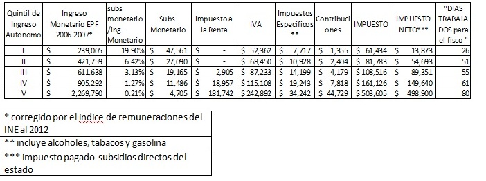 Para esta aproximación se incluyeron los pagos que realizan las familias por concepto de IVA, impuesto a la renta e impuestos específicos a los alcoholes, tabacos, juegos de azar y combustible, de acuerdo a los niveles de consumo reportados en la EPF 2006-2007 para quintil de familias. Para determinar el número de días dedicados a trabajar para pagar impuesto se consideró tanto las transferencias que hacen las familias al tesoro (pago de impuestos) como las transferencias que el gobierno hace a las familias de forma directa y se calculó sobre un año de 365 días.