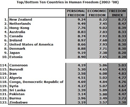 Desde luego que no sorprende ver a Nueva Zelanda, Holanda y Hong Kong liderando este ránking. Las naciones con peor calificación no sorprenderán a nadie, ni mucho menos: Zimbabwe, Myanmar (antes, Burma) y Paquistán. En ocasiones en que atendemos a casos y regiones específicos, algunos de los resultados causan sorpresa. Singapur, por ejemplo, que se sitúa en la segunda posición en libertades económicas, cae al número 39 en lo que tiene que ver con libertad humana, detrás de El Salvador e, incluso, Albania. La Argentina, un país que ha malgastado una incontable riqueza a partir de la restricción de las libertades económicas, escala desde su puesto número 94 en libertad económica, hacia el puesto 56 en libertad humana.