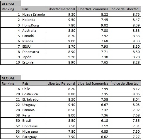 Los resultados del estudio caen dentro de lo que podría esperarse con países como Nueva Zelandia, Holanda, Hong Kong y Australia a la cabeza. Dentro de la región destaca nuestro país siendo el mejor posicionado y el 16° a nivel mundial en cuanto a Libertad Humana -Libertad Económica y Libertad Personal-. En los últimos lugares se encuentra Pakistan, Burma y Zimbabwe.