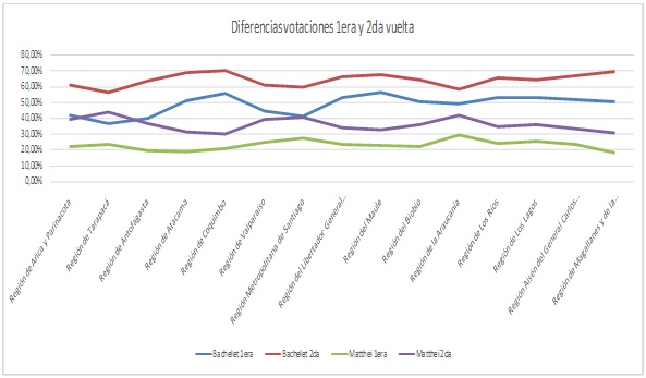 Si analizamos algunos números preliminares de hoy, destaca, en primer lugar, que Bachelet sumó cerca de 400 mil votos en relación a la primera vuelta (cuando llegó a 3,070 millones). Matthei, por su parte, sumó más de 460 mil. La primera fue capaz de sumar 210 mil nuevos votos en la Región Metropolitana; la segunda más de 183.000; la primera cerca de 48.000 en la V, la segunda 56.000. Un análisis detallado de estos números resultará relevante para analizar la eficacia con la que operaron las campañas a nivel regional.