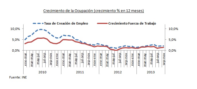 Cualquier revisión del desempeño económico en 2013 necesariamente ha de comenzar por el mercado laboral. Francisco Klapp, investigador del Programa Económico de LyD, señala que las espectaculares cifras de los últimos 11 meses (hasta enero no conoceremos los resultados del último trimestre móvil del año) consolidan a 2013 como el mejor año desde que se realiza la nueva encuesta. Probablemente también sea el mejor de los últimos 15 años, aunque no sean estrictamente comparables en términos de desempleo, crecimiento de las remuneraciones y participación femenina.