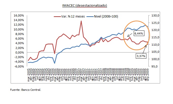 Un segundo elemento que caracterizó al año 2013, es la tan anticipada –y finalmente concretada- desaceleración de la actividad económica, reflejada nítidamente por el IMACEC y otros Indicadores Sectoriales. " Este menor dinamismo se concentra especialmente en las inversiones, pero no así en el consumo, el cual sólo ha mostrado un acotado menor dinamismo que en el pasado", explica el economista. A nivel sectorial, mientras el comercio no muestra desgaste, la producción industrial muestra magros resultados en lo que va del año.