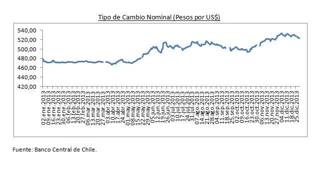 Con mayo, llegó el cambio. "El peso empezó a depreciarse frente a la divisa americana, lo que se explicaría por un menor influjo de capitales al país y las perspectivas, tras declaraciones de Ben Bernanke, de que el increíblemente expansivo programa de compra de activos por parte de la FED comenzaría su retirada", comenta Klapp. Desde entonces, la moneda norteamericana ha seguido un camino de apreciación frente a las monedas emergentes (entre ellas naturalmente el peso), y así con la profundización de la desaceleración local, la baja de la TPM en Chile y el comienzo efectivo del retiro del QE3, hemos llegado a ver un tipo de cambio que incluso superó los $ 533 a comienzos de diciembre.
