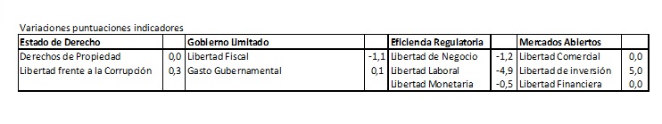 El retroceso en el puntaje de nuestro país se debe al empeoramiento en cuanto a la Libertad Fiscal y la Eficiencia Regulatoria, lo que es parcialmente contrapesado por un aumento en lo referente a Libertad de Inversión. En este punto, vale la pena recordar que los 10 componentes del índice tienen igual ponderación y se confieren puntajes entre 0 y 100 para cada uno de ellos.