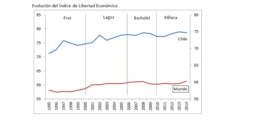 Chile mantiene el séptimo lugar en el Índice de Libertad Económica, conservando su liderazgo en la región. Mantuvo su lugar en relación al 2012 y 2013, pero obtuvo una puntuación levemente menor, en respuesta a reformas que han aumentado el tamaño del estado y la carga tributaria, así como un crecimiento del salario mínimo que excedería las ganancias en productividad de nuestro país. Así, el puntaje obtenido en el último ranking (78,7) se observa que es inferior al alcanzado en 2013, que llegó a 79,0.