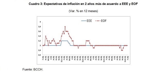 Por otra parte, el investigador explica que con los antecedentes expuestos, y considerando que las expectativas de inflación de los privados para los próximos 24 meses -por ejemplo reflejadas a través de la Encuesta de Expectativas Económicas (EEE) y la Encuesta de Operadores Financieros (EOF)- se encuentran ancladas en el centro del rango meta del central, es que el mercado anticipaba una rebaja en la tasa rectora (ver cuadro 3). “Más aun, los agentes anticipan otra rebaja de 0,25 pb dentro del año, la que se mantendría por algún tiempo de acuerdo a la EEE y la EOF”, señala.