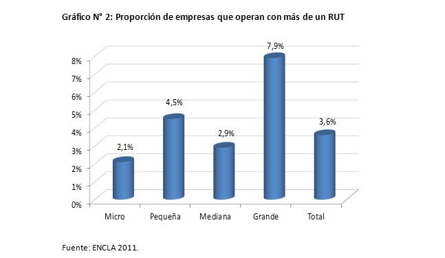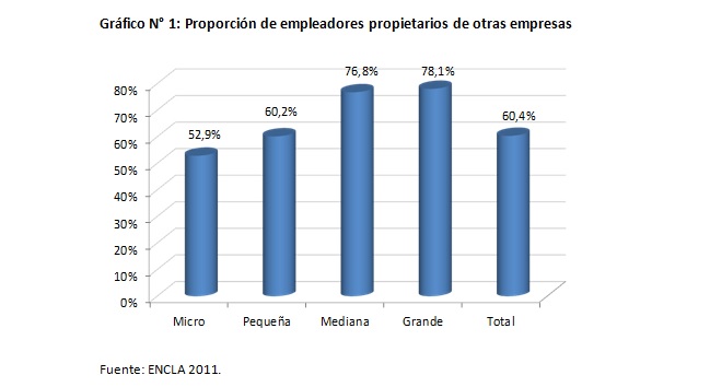 Como punto de partida, es una realidad absolutamente mayoritaria en Chile el que los empresarios tengan más de una empresa, situación que no sólo es efectiva para las grandes empresas, sino que se da en forma pareja en todos los tamaños de firmas, como muestra el Gráfico N° 1, con datos de la Encuesta Laboral (ENCLA) 2011.