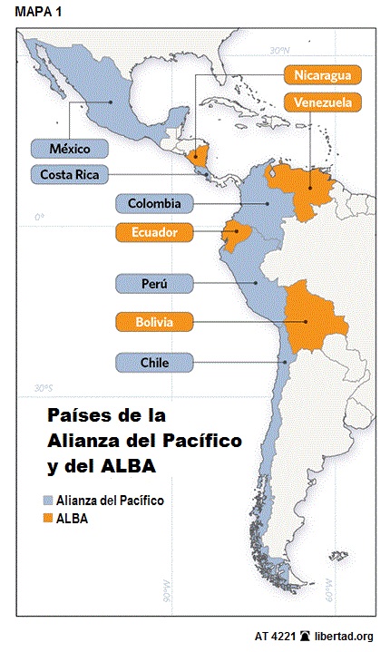 En la parte oeste del continente, sin embargo, se encuentra la Alianza del Pacífico, con Chile, Colombia, Costa Rica, México, Perú y posiblemente Panamá, cuyos miembros adoptan un enfoque de mercado, con el Estado centrado en mejorar la transparencia y la eficiencia en los flujos de capitales, bienes e ideas y en ampliar la confianza de los inversores en el Estado de Derecho, el cumplimiento de los contratos y la protección de la propiedad intelectual y material. Los beneficios a largo plazo, reflejados en la voluntad de continuar con estas normativas, se hacen patentes con un simple vistazo a sus respectivos niveles de libertad económica.