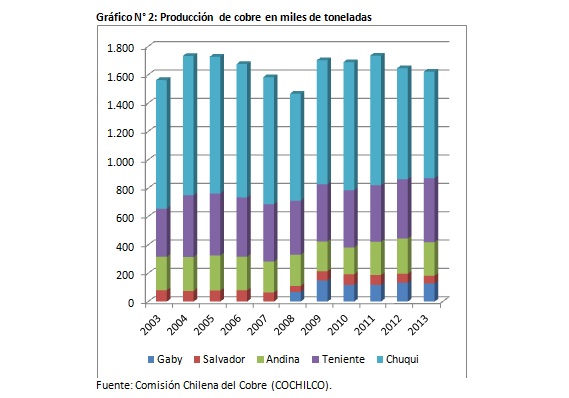 En el intertanto, la producción de CODELCO se ha mantenido relativamente estable, con una tendencia a caer a partir de 2011, como se observa en el siguiente gráfico: