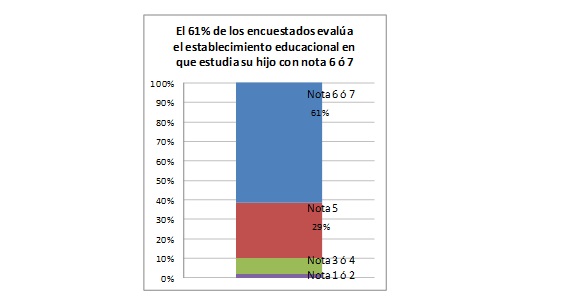 Adicionalmente, se consultó a los padres por el nivel de satisfacción con la educación que reciben sus hijos. El 60% de los encuestados evalúa el establecimiento en el que estudia su hijo con nota 6 ó 7, mientras que sólo el 2% lo evalúa con nota 1 ó 2. Estos resultados tienden a mantenerse al analizarlos según tipo de establecimiento: 56% en el sector municipal, 62% del sector particular subvencionado y 69% del particular pagado evalúan el establecimiento al que asisten sus hijos con nota 6 ó 7. Esto es, de manera consistente, más de la mitad de los padres evalúa el colegio al que asisten sus hijos con nota mayor a 6.