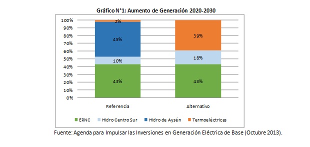 Cabe recordar que el proyecto de ley aprobado en 2013, que fuerza a que 20% de la energía del sistema sea suministrada por ERNC al año 2025, ya impone un desafío importante, puesto que cerca del 45% de la nueva capacidad de generación eléctrica que se instale de aquí a esa fecha deberá provenir de dicha fuente. En consecuencia, difícilmente puede esperarse que logren levantarse proyectos adicionales que permitan suplir la energía que dejaría de ser provista por HidroAysén.