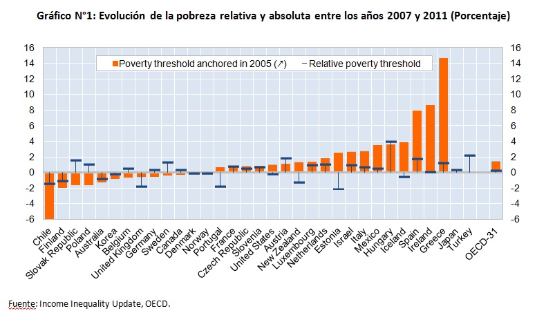 Luego, cuando se analizan los datos de pobreza, Chile sigue siendo uno de los países que más avanza. Mientras que en el promedio de los países de la OCDE la pobreza relativa[5] aumenta de 11,5% a 11,2% en el período de recuperación de la crisis, Chile disminuye de 19,2% a 17,8%[6]. A su vez, Chile es el país que más disminuye la pobreza absoluta o anclada en el año 2005 durante ese mismo período, en un -5,9% (Ver Gráfico N°1).