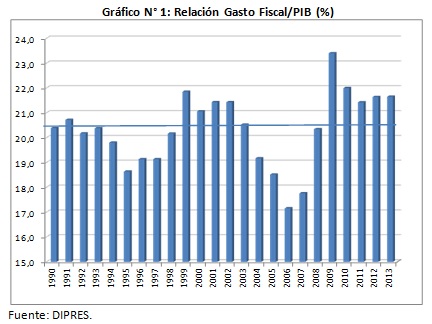 El análisis muestra que el resultado fiscal de 2013 resultó mejor a lo proyectado en la discusión de la Ley de Presupuestos 2014. La mejoría se explicó tanto por mayores ingresos como por sub-ejecución del gasto. No obstante, los ingresos generados por traspasos de CODELCO resultaron finalmente inferiores a lo proyectado, en una tendencia que parece hacerse habitual. Finalmente, el año 2013 terminó con un déficit efectivo de 0,6% del PIB y estructural de 0,5% del PIB, ambas cifras por debajo de lo estimado en septiembre pasado, de 1% del PIB. En definitiva, el gobierno anterior logró reducir el déficit estructural en 2,5 puntos del PIB, aunque no se eliminó totalmente el fuerte impulso fiscal introducido en 2008 y 2009. Recordemos que entre 2007 y 2009, la relación gasto/PIB subió de 17,8% a 23,4%, cayendo a un 21,6% del PIB en 2013. El siguiente gráfico muestra la relación Gasto del Gobierno Central/PIB para el período 1990-2013: