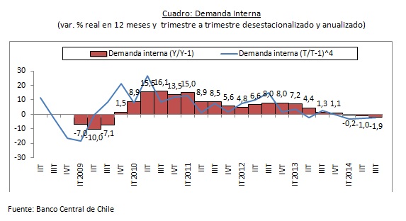 De hecho, la demanda interna vuelve a contraerse, tanto interanualmente como en comparación al trimestre anterior corrigiendo por estacionalidad indicador ampliamente seguida en los EE.UU.-, de esta forma lo que mantiene el PIB creciendo, aunque escasamente, es la demanda externa con unas exportaciones de bienes y servicios, que medidas en pesos se expanden un 1%, mientras las importaciones (también en pesos) se contraen un 7,2% versus igual periodo del año anterior.