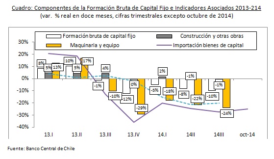 El siguiente cuadro sirve para ilustrar claramente como la Formación Bruta de Capital Fijo tras haberse expandido de manera sólida durante el primer semestre de 2013, ha sufrido una abrupta caída que no da señales de detenerse, especialmente en su componente Maquinaria y Equipos, el cual no tiene la conocida inercia de la Construcción.