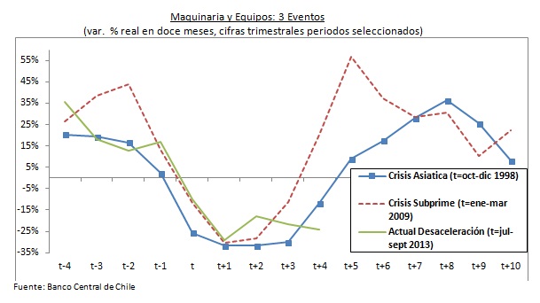 Una mirada más cercana a estos tres eventos permite una mejor comparación. El siguiente gráfico denomina t al primer trimestre de caída en la inversión en maquinaria y equipos con respecto a igual periodo del año anterior, t-i al i-esimo periodo previo a t y t+i al i-esimo periodo posterior. Por ejemplo, en la Crisis Asiatica t equivale al cuarto trimestre de 1998 y por lo tanto t+1 equivale al primer trimestre de 1999.