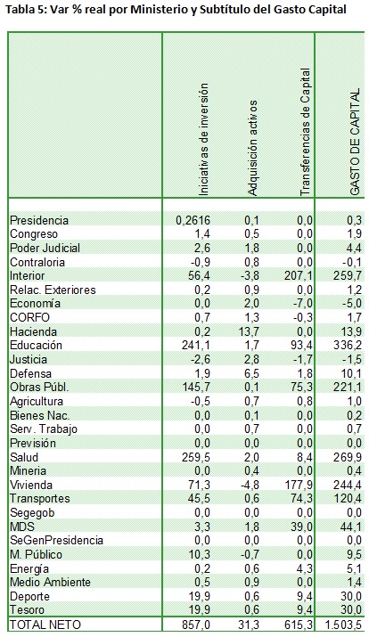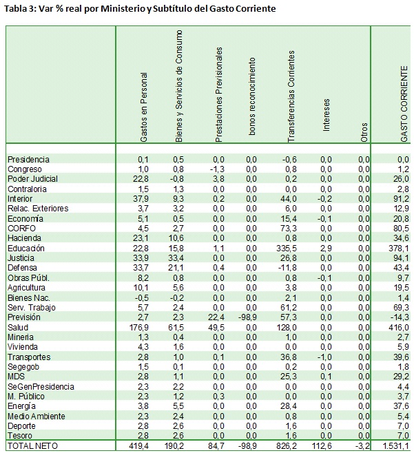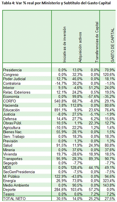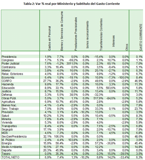 Llama la atención el incremento en gasto de personal y de funcionamiento de las diferentes partidas, reflejando un incremento mayor en la gestión que en las prestaciones que realiza el gobierno, reflejadas en el gasto corriente. En términos porcentuales destacan especialmente Ministerios en proceso de maduración, como Deportes y Medio Ambiente, lo que igualmente debe analizarse con cautela. Sin embargo, es más llamativo el incremento de los Ministerios políticos como Secretaría General de Gobierno y de la Presidencia. Con todo, el incremento en gasto en personal y de consumo va más allá de un tema puntual, pasando a ser masivo. Tanto así, que en términos porcentuales los incrementos de Junji por ejemplo no alcanzan a destacar dentro de la tendencia global, así como tampoco el Ministerio de Hacienda, pese a su abultada tasa es significativamente mayor a otras carteras, pese al impulso de la Reforma Tributaria que entrega recursos considerables al servicio de Impuestos Internos, Aduanas y tesorería.
