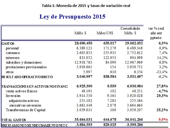 El proyecto de ley de Presupuestos 2015 presenta un incremento real respecto de la ley aprobada en 2014 igual a 9,9% real. Para estos efectos se ha considerado para 2014 un tipo de cambio igual a 565 $/US$, mientras que para 2015 se usó uno de 585 $/US$. Para la inflación se consideró un promedio igual a 3%