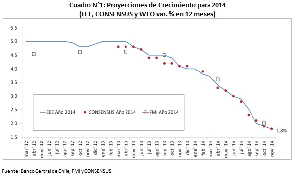 Tal como lo ilustra el Cuadro N°1, las proyecciones de crecimiento para 2014 comienzan a mediados de 2013 a deteriorarse levemente, "sin embargo, no es hasta inicios de 2014 que los pronósticos comienzan a ser sistemáticamente más bajos", explica Klapp. Así, si en diciembre de 2013 la mediana de la EEE era de un 4,0%, ya en agosto dicha medida era de apenas un 2,5%.