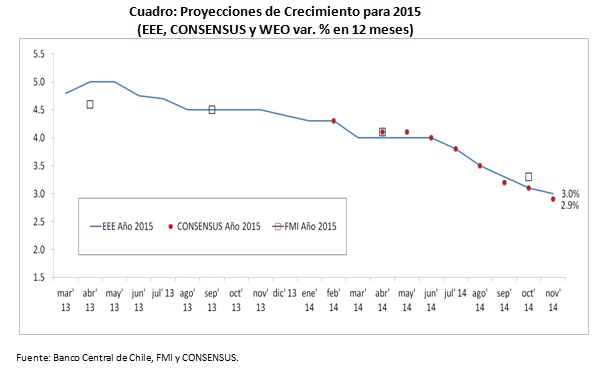 En cuanto a las expectativas para 2015, el deterioro sigue un patrón bastante similar, con una moderación durante la segunda mitad de 2013, y una caída más pronunciada en 2014, donde las proyecciones a noviembre alcanzaban apenas un 3,0% de acuerdo a CONSENSUS y un 2,9% de acuerdo a la EEE para el año que viene.