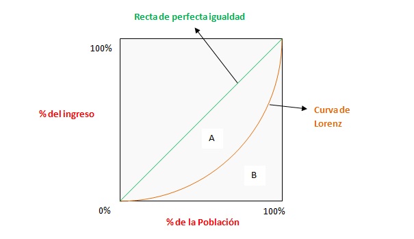 Precisamente, el Coeficiente de Gini se basa en la distancia entre la Curva de Lorenz y la recta de 45° que representaría una distribución perfectamente igual del ingreso. La Curva de Lorenz define dos áreas A y B. Mientras mayor sea la desigualdad, el área A se va a hacer más grande y la B más pequeña. Con perfecta igualdad, el área A desaparece, mientras que con perfecta desigualdad (todo el ingreso lo tiene una persona y el resto no tiene nada) el área B desaparece.