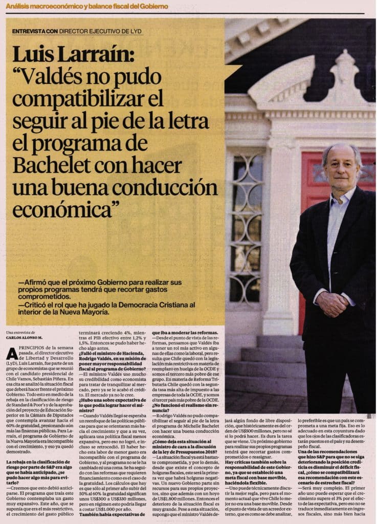 A principios de la semana pasada, el Director Ejecutivo de Libertad y Desarrollo (LyD), Luis Larraín, fue parte de un grupo de economistas que se reunió con el candidato presidencial de Chile Vamos, Sebastián Piñera. En esa cita se analizó la situación fiscal que deberá hacer frente el próximo Gobierno. Todo esto en medio de la rebaja en la clasificación de riesgo de Standard & Poor’s y de la aprobación del proyecto de Educación Superior en la Cámara de ecDiputados que contempla avanzar hacia el 60% de gratuidad, presionando aún más las finanzas públicas. Para Larraín, el programa de Gobierno de la Nueva Mayoría era incompatible con el crecimiento, y eso ya quedó demostrado.