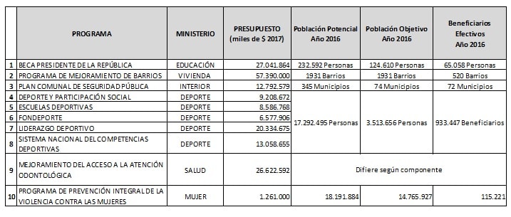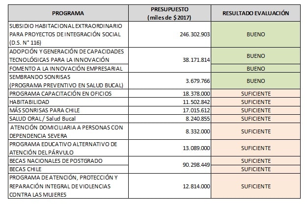 En magnitud de presupuesto, se trata de 182.874.711 miles de pesos que se destinan a iniciativas con mala evaluación, donde cabe hacer presente que algunos de los programas como el de mejoramiento de barrios o los de deporte y becas, llevan en promedio más de 10 años ejecutándose. En cuanto a los resultados de la evaluación esta concluye que los programas tienen una carga administrativa muy importante y otros presentan problemas de focalización. Más relevante aun, en algunos de ellos se consigna un problema de diagnóstico que pone en entredicho la pertinencia del programa o se carece de metas, prioridades y resultados esperados.