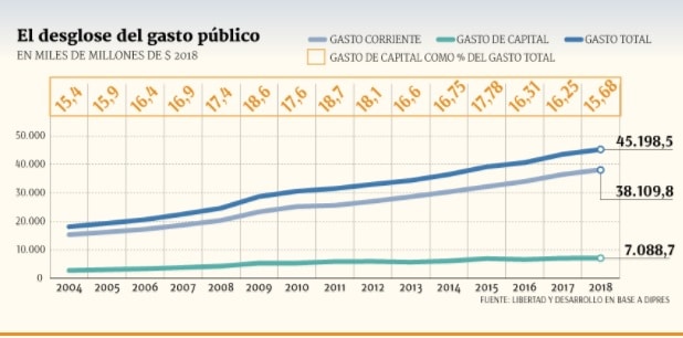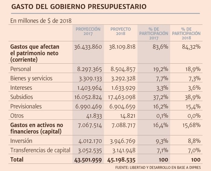 ¿Qué es lo que crece, entonces? El gasto corriente, destinado a financiar el funcionamiento del Fisco, se incrementa 4,8% el próximo año, superando los $ 38 billones (unos US$ 61.000 millones). Así, aumentó de 83,6% a 84,32% su peso en el Presupuesto total para 2018. El gasto corriente se des- glosa en desembolsos que realiza el Fisco para el pago del personal que se desempeña en el Estado, la adquisición de bienes y servicios, pagos de intereses sobre deudas, subsidios y aportes previsionales, entre , otros.