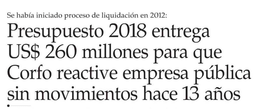 Dicho lo anterior, corresponde señalar que en el presente ejercicio presupuestario, se contemplan gastos de CORFO como transferencia a la empresa por $4.500 millones, y para el 2018 se contempla expresamente una capitalización vía glosa: