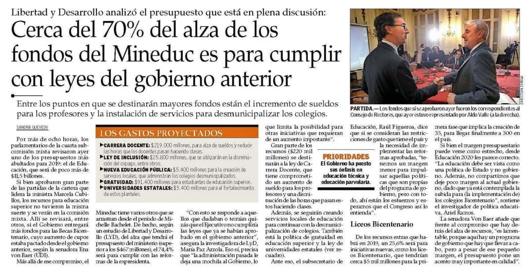 Un 74,4% del mayor gasto para 2019 se explica por el avance en las leyes de Carrera Docente, de inclusión, gratuidad de la educación superior, ley de universidades estatales y por la implementación de los nuevos servicios locales de educación que se harán cargo de la educación escolar pública, es decir, por la implementación de las principales leyes asumidos por el gobierno anterior.